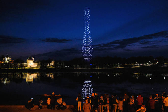 Drones formam a figura de um foguete iluminam o céu na véspera do Dia da Cosmonáutica em Veliky Novgorod, na Rússia